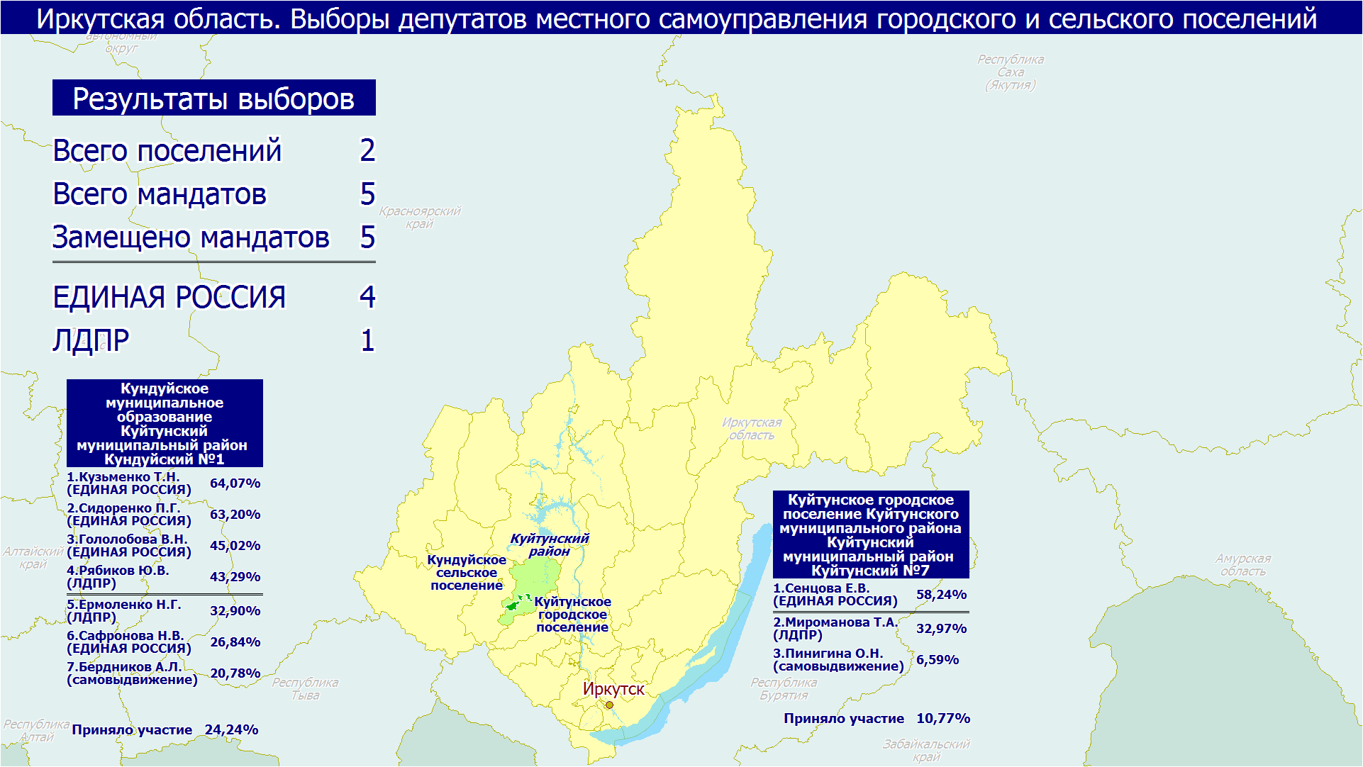 В Куйтунском муниципальном районе прошли выборы депутатов представительных органов Куйтунского городского поселения и Кундуйского сельского поселения. Выборы признаны состоявшимися. Замещалось пять депутатских мандатов. По предварительным данным, большинство голосов избирателей получили четыре кандидата, выдвинутые избирательным объединением «Всероссийская политическая партия «ЕДИНАЯ РОССИЯ», и один кандидат, выдвинутый избирательным объединением «Политическая партия ЛДПР - Либерально-демократическая партия России».