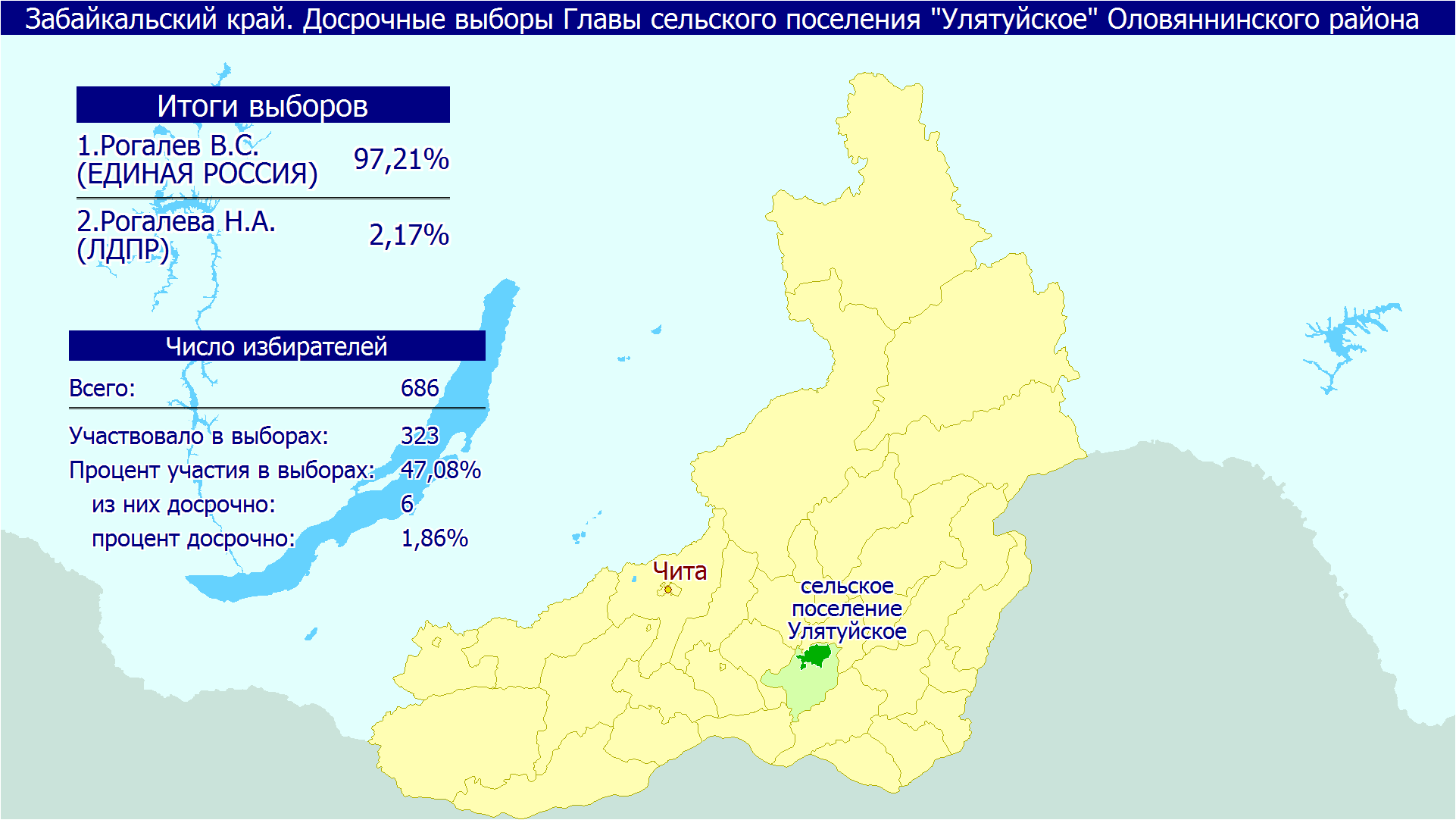 В Оловяннинском районе прошли досрочные выборы Главы сельского поселения «Улятуйское». Выборы признаны состоявшимися. В выборах приняло участие 47,08 процента от общего числа зарегистрированных избирателей. По предварительным данным, большинство голосов избирателей (97,21 %) получил Рогалев Владимир Сергеевич, выдвинутый избирательным объединением «Всероссийская политическая партия «ЕДИНАЯ РОССИЯ».
