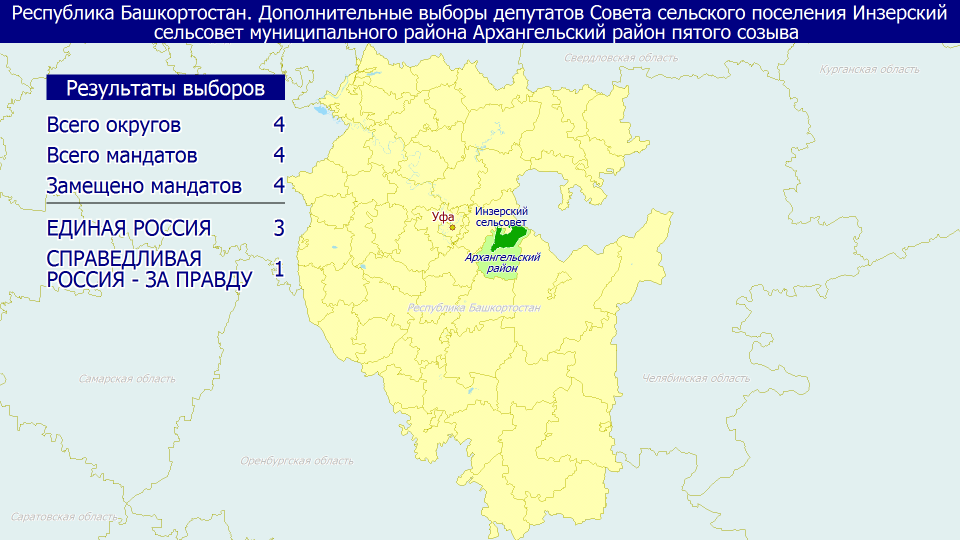 В Архангельском районе прошли дополнительные выборы депутатов Совета сельского поселения Инзерский сельсовет пятого созыва. Выборы признаны состоявшимися. Замещалось четыре депутатских мандата по одномандатным избирательным округам. По предварительным данным, большинство голосов избирателей получили три кандидата, выдвинутые избирательным объединением «Башкортостанское региональное отделение Всероссийской политической партии «ЕДИНАЯ РОССИЯ», и один кандидат, выдвинутый избирательным объединением «Региональное отделение Социалистической политической партии «СПРАВЕДЛИВАЯ РОССИЯ – ПАТРИОТЫ – ЗА ПРАВДУ» в Республике Башкортостан».