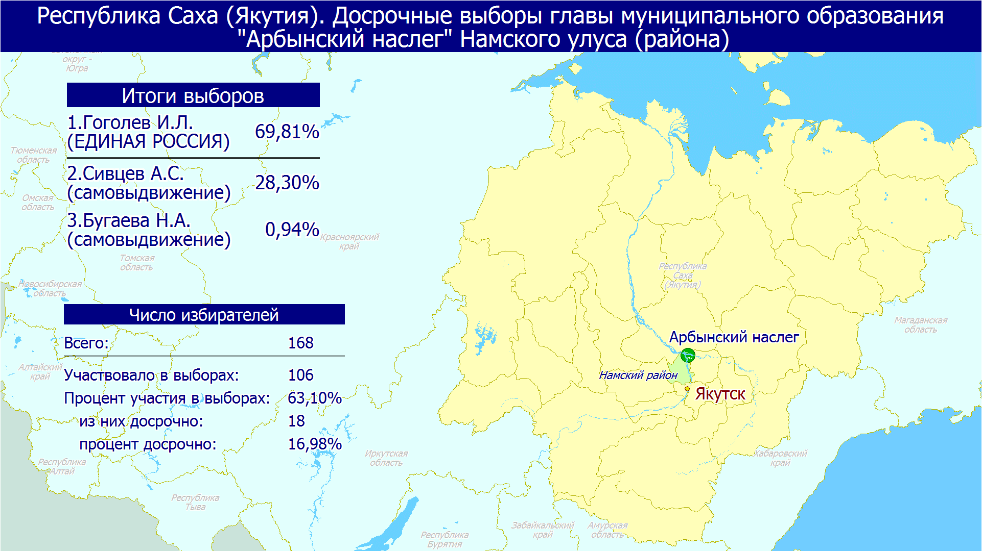 В Намском улусе (районе) прошли досрочные выборы главы муниципального образования «Арбынский наслег». Выборы признаны состоявшимися. В выборах приняло участие 63,1 процента от общего числа зарегистрированных избирателей. По предварительным данным, большинство голосов избирателей (69,81 %) получил Гоголев Игорь Леонидович, выдвинутый избирательным объединением «Якутское региональное отделение Всероссийской политической партии «ЕДИНАЯ РОССИЯ».