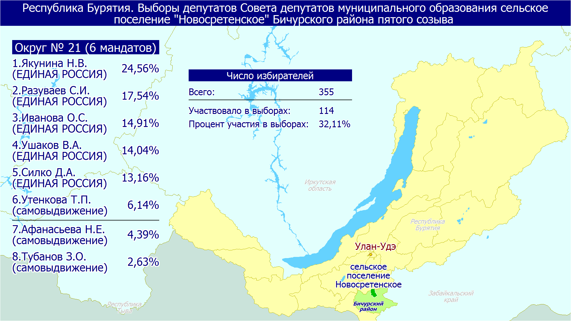 В Бичурском районе прошли выборы депутатов Совета депутатов муниципального образования сельское поселение «Новосретенское» пятого созыва. Выборы признаны состоявшимися. Замещалось шесть депутатских мандатов по многомандатному избирательному округу. В выборах приняло участие 32,11 процента от общего числа зарегистрированных избирателей. По предварительным данным, большинство голосов избирателей получили пять кандидатов, выдвинутых избирательным объединением «Бичурское местное отделение Бурятского регионального отделения Всероссийской политической партии «ЕДИНАЯ РОССИЯ», и один кандидат, выдвинутый в порядке самовыдвижения.