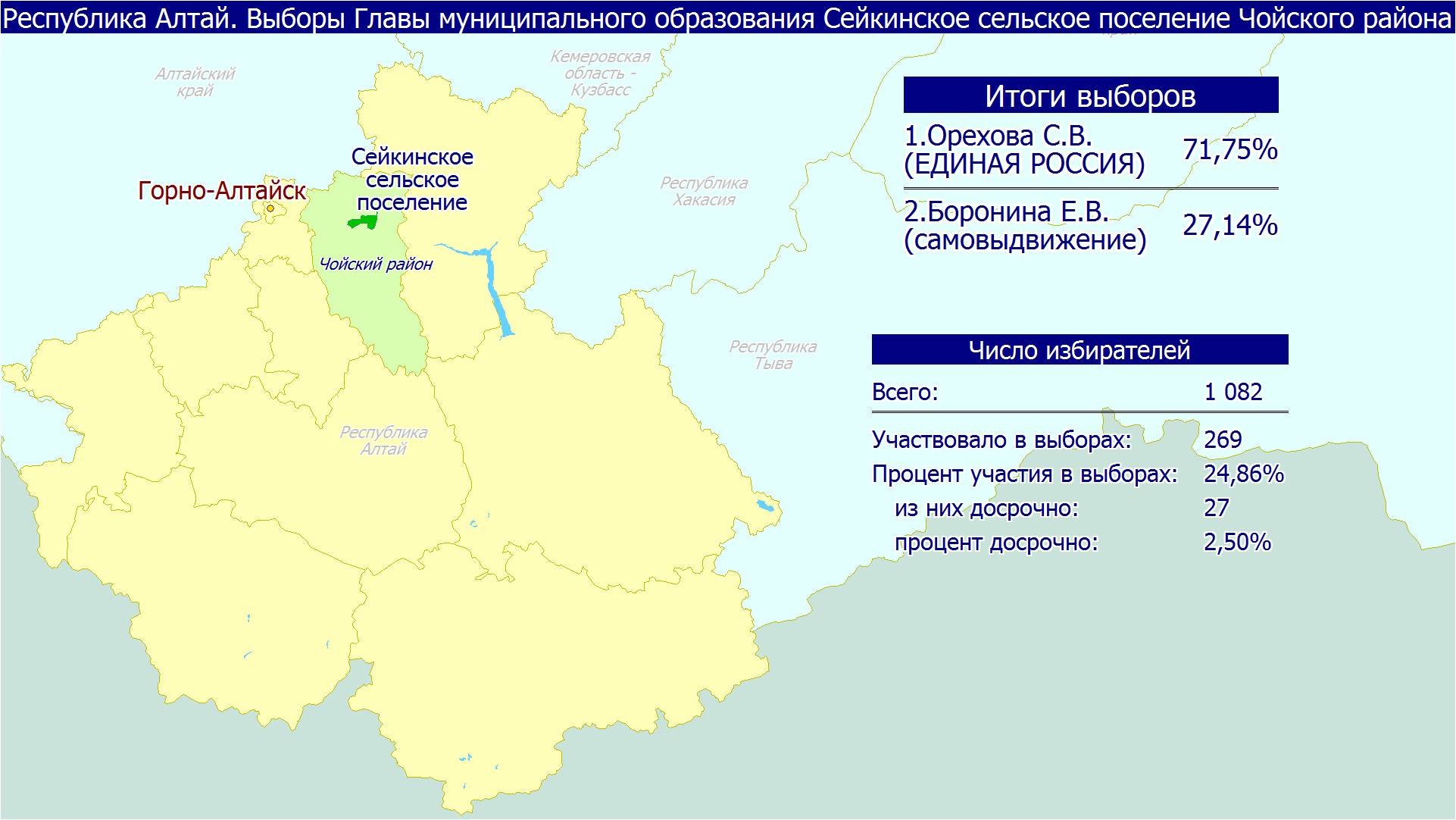В Чойском районе прошли выборы Главы муниципального образования Сейкинское сельское поселение. Выборы признаны состоявшимися. В выборах приняло участие 24,86 процента от общего числа зарегистрированных избирателей. По предварительным данным, большинство голосов избирателей (71,75 %) получила Орехова Светлана Владимировна, выдвинутая избирательным объединением «Чойское местное отделение Всероссийской политической партии «ЕДИНАЯ РОССИЯ».