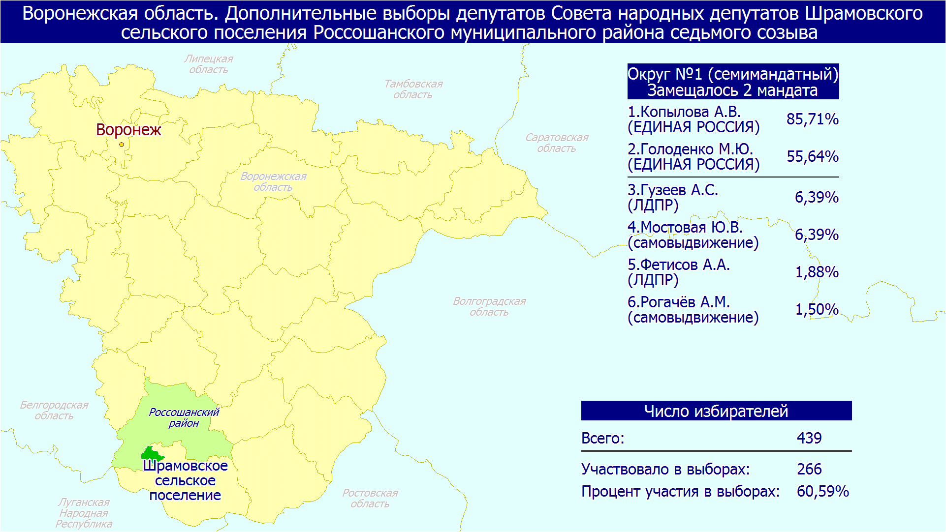 23–24 декабря в Россошанском муниципальном районе проводилось голосование на дополнительных выборах депутатов Совета народных депутатов Шрамовского сельского поселения седьмого созыва. Выборы признаны состоявшимися. Замещалось два депутатских мандата по многомандатному избирательному округу. В выборах приняло участие 60,59 процента от общего числа зарегистрированных избирателей. По предварительным данным, большинство голосов избирателей получили два кандидата, выдвинутые избирательным объединением «Россошанское местное отделение Воронежского регионального отделения Всероссийской политической партии «ЕДИНАЯ РОССИЯ».