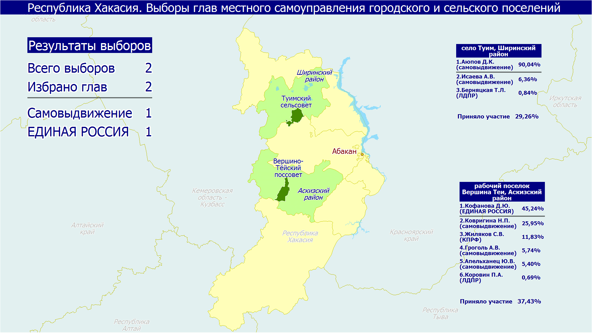 23–24 декабря в двух районах проводилось голосование на выборах глав Вершино-Тейского поссовета Аскизского района и Туимского сельсовета Ширинского района. Выборы признаны состоявшимися. По предварительным данным, большинство голосов избирателей получили: один кандидат, выдвинутый избирательным объединением «Всероссийская политическая партия «ЕДИНАЯ РОССИЯ», и один кандидат, выдвинутый в порядке самовыдвижения.