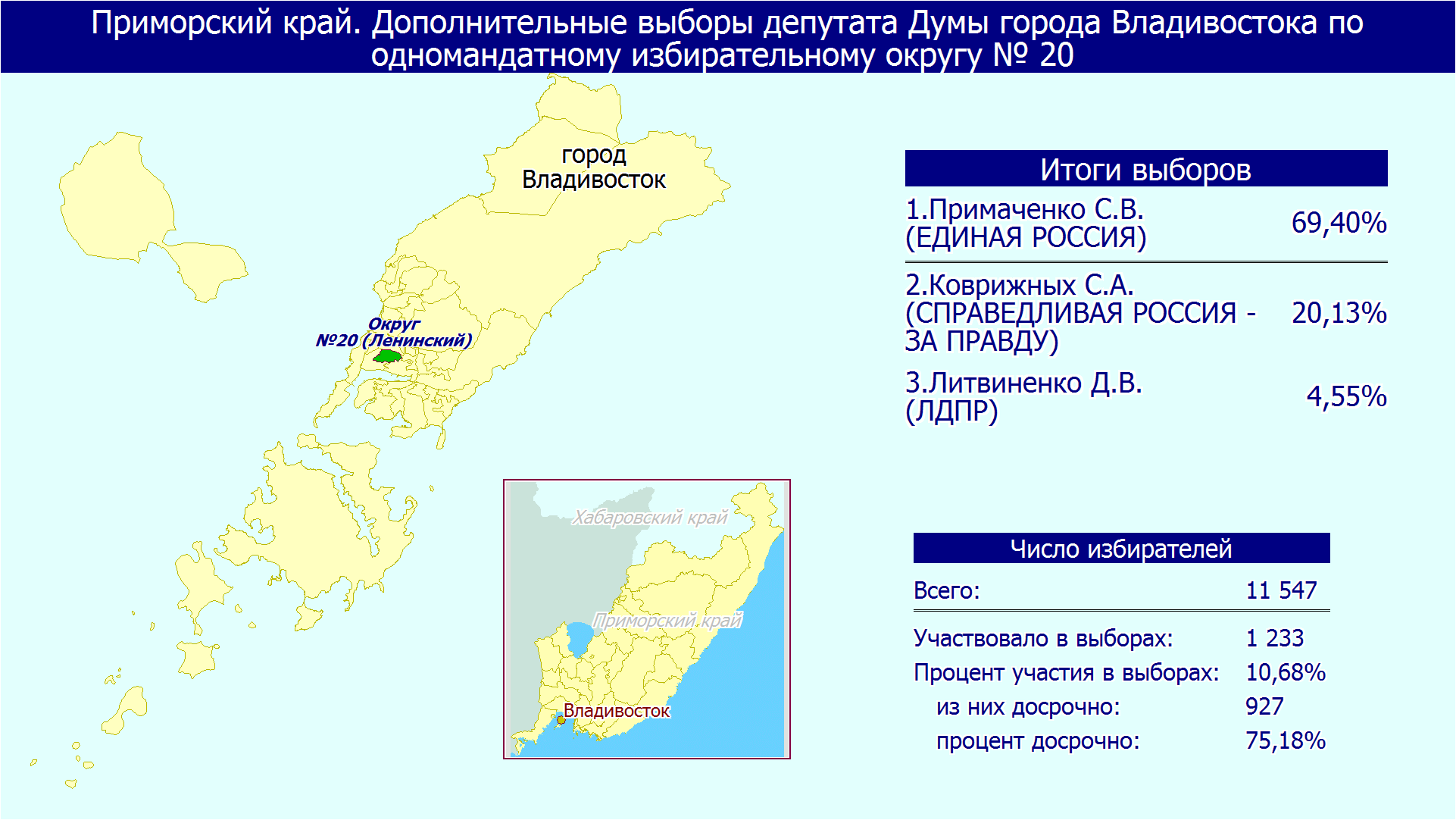 Дополнительные выборы депутата Думы города Владивостока по одномандатному избирательному округу № 20 признаны состоявшимися. В выборах приняло участие 10,68 процента от общего числа зарегистрированных избирателей. По предварительным данным, большинство голосов избирателей (69,4 %) получил Примаченко Станислав Владимирович, выдвинутый избирательным объединением «Приморское региональное отделение Всероссийской политической партии «ЕДИНАЯ РОССИЯ».