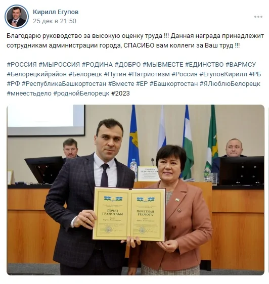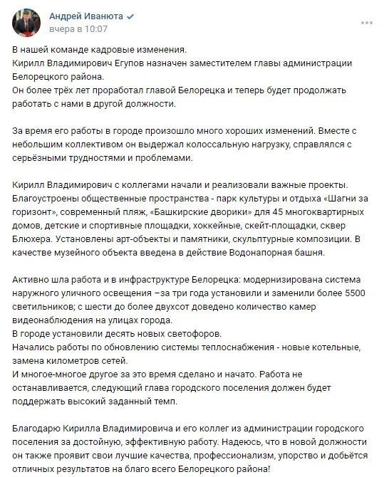 Интересны и хвалебные посты в связи с этой кадровой перестановкой. Так, глава Белорецкого районаАндрей Иванютав своих соцсетях упомянул заслуги Егупова на посту мэра. А до этого, 25 декабря, сам Егупов похвастался почетной грамотой от Курултая «за значительный вклад в развитие местного самоуправления» (добавил, что это заслуга команды). Вчера уже заместитель главы Белорецкого района Кирилл Егупов рассказал в соцсетях о своей новой деятельности – он побывал на съезде муниципальных образований, где в первую очередь проинформировал о замене и ремонте труб в городе. Кстати,ушелЕгупов со своего поста практически сразу после двух коммунальных аварий в Белорецке, произошедших в один день, – прорвало трубы, из-за чего без отопления осталась даже местная администрация.