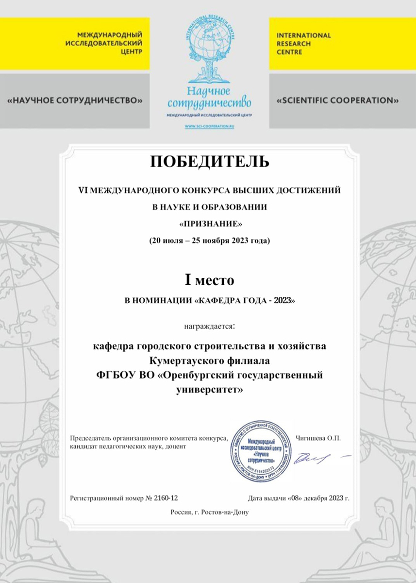 Отметим, что в ноябре кафедра городского строительства признана лучшей в VI Международном конкурсе высших достижений в науке и образовании «Признание — 2023», организованном Международным исследовательским центром «Научное сотрудничество». В конкурсе приняли участие представители из Азербайджанской Республики, Республики Казахстан и Российской Федерации.
