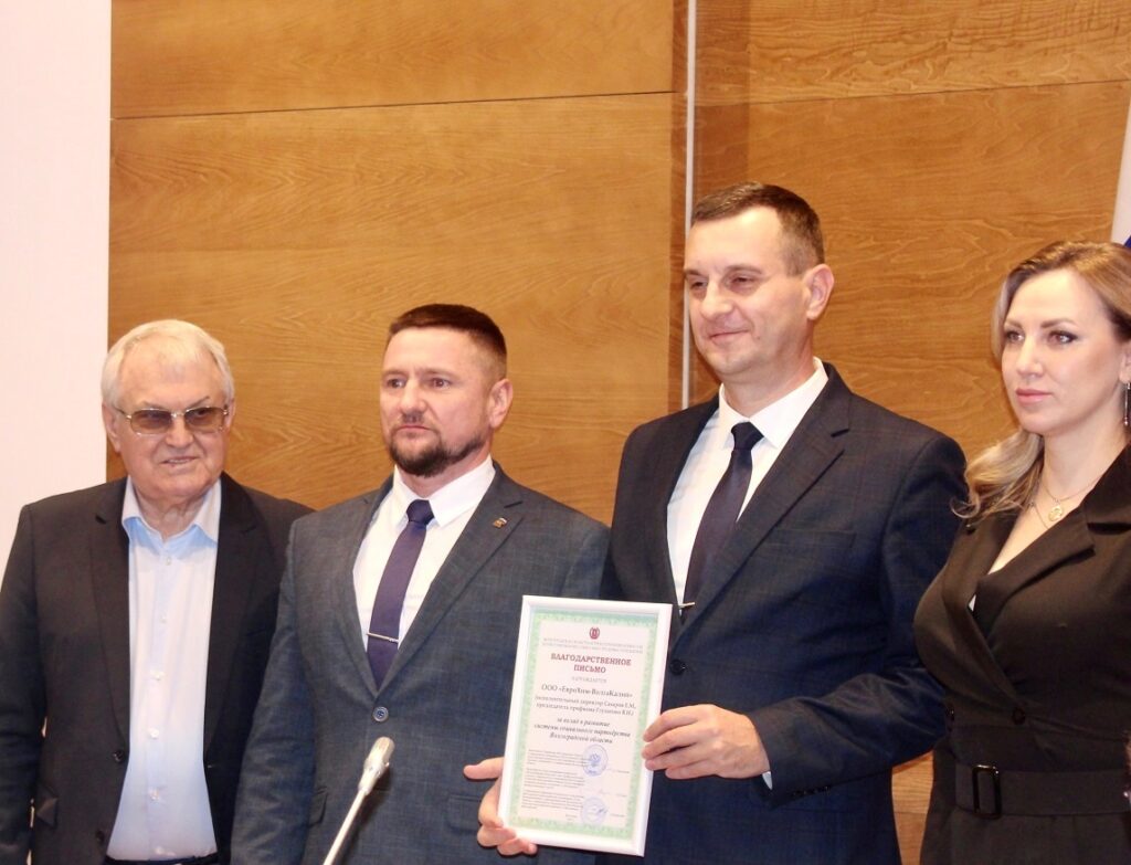 Исполнительному директору Евгению Сахарову и председателю профсоюзной организации ЕвроХим-ВолгаКалия Виктору Глущенко вручено благодарственное письмо, подписанное заместителем губернатора Волгоградской области, председателем Волгоградского областного Совета профсоюзов и сопредседателем Союза промышленников и предпринимателей Волгоградской области.
