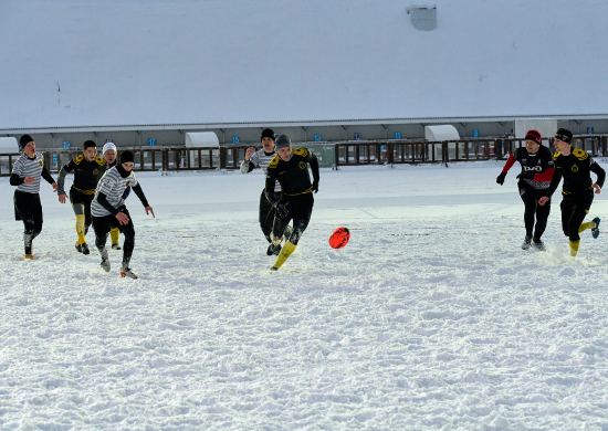 Регби на снегу, в отличие от классического регби играют команды по пять игроков на гораздо меньшей по размеру площадке. Правила те же: играть можно только руками, победит тот, кто занесет больше мячей в зону противника. Игра продолжается по два тайма, продолжительность каждого - пять минут.