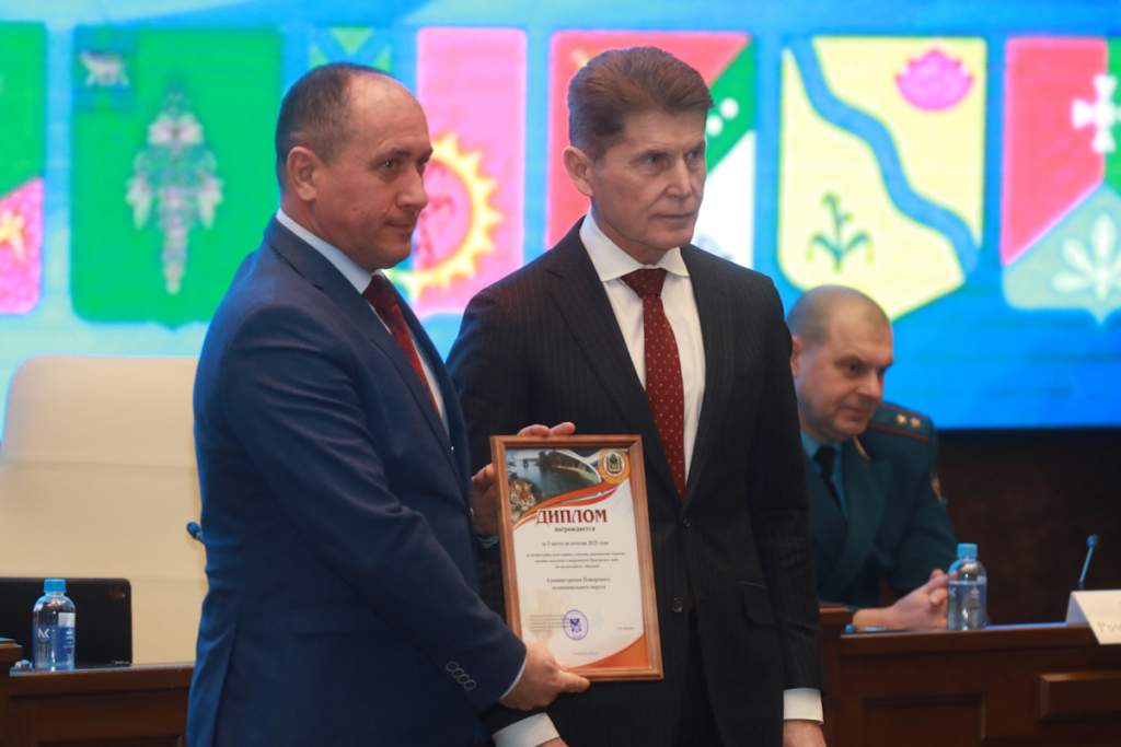 Также в ходе подведения итогов за достигнутые результаты в области гражданской обороны, защиты населения и от чрезвычайных ситуаций Олег Кожемяко вручил дипломы и кубки лучшим муниципалитетам, пожарным и спасательным подразделениям Приморского края.