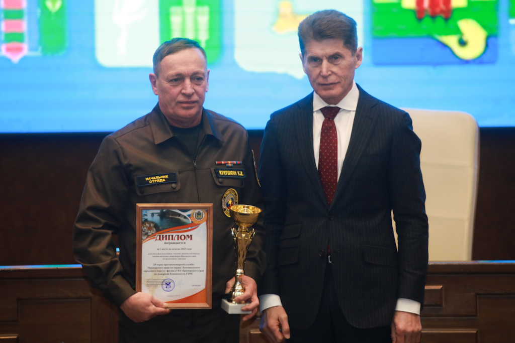 Также в ходе подведения итогов за достигнутые результаты в области гражданской обороны, защиты населения и от чрезвычайных ситуаций Олег Кожемяко вручил дипломы и кубки лучшим муниципалитетам, пожарным и спасательным подразделениям Приморского края.