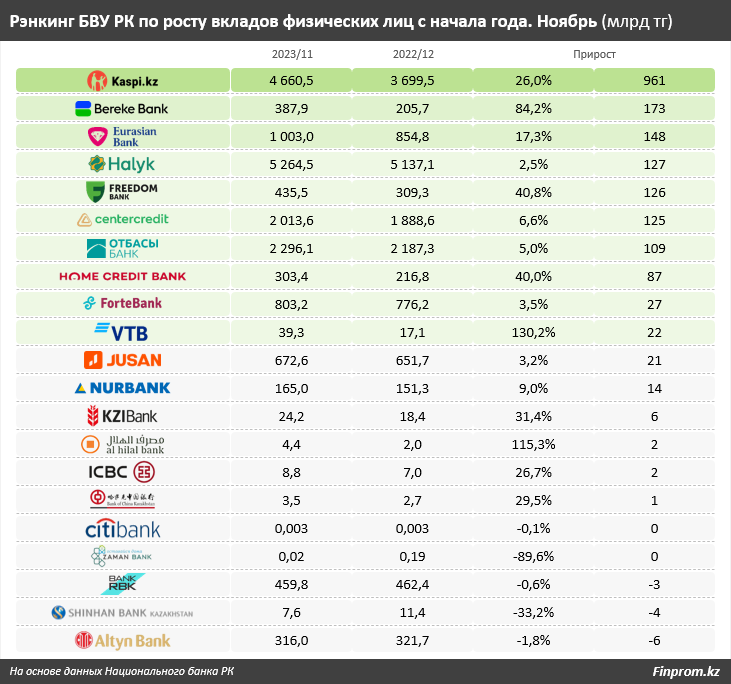 Лидером по росту вкладов физлиц стал Kaspi Bank: с начала года депозиты населения в этом фининституте увеличились на 961 млрд тг, или на 26%. Общая сумма розничных вкладов здесь достигла 4,7 трлн тг.