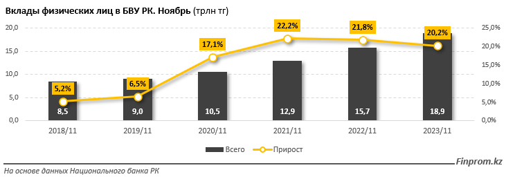 2023 год в банковском секторе страны характеризовался заметным ростом депозитов физических лиц. В результате к декабрю 2023 года вклады физических лиц в банках страны увеличились на 1,9 трлн тг, или на 11,5% с начала года, достигнув 18,9 трлн тг.