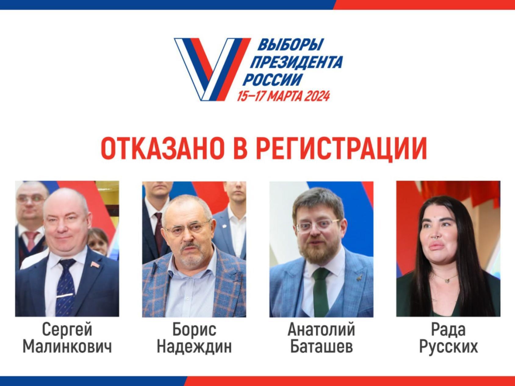 Как сообщили в ЦИК, основанием для отказа в регистрации стало недостаточное количество достоверных подписей либо выявление пяти и более процентов недостоверных и недействительных подписей избирателей, собранных в поддержку выдвижения кандидата.