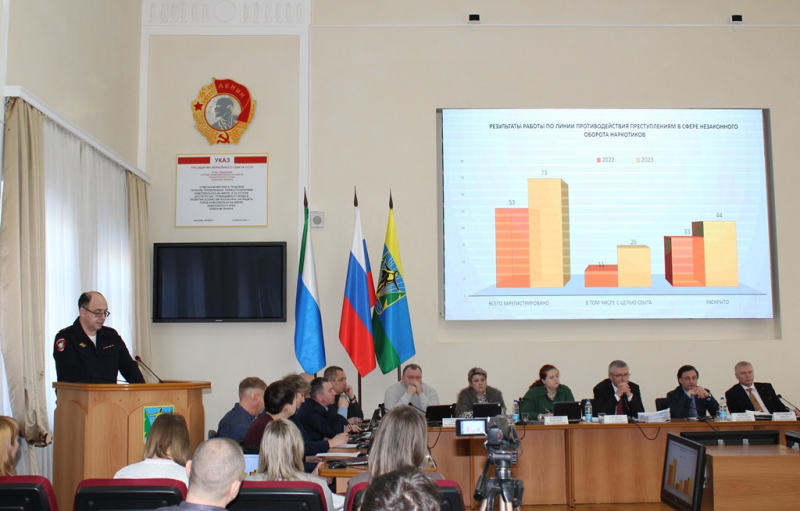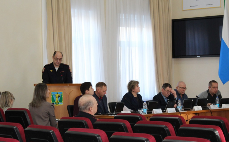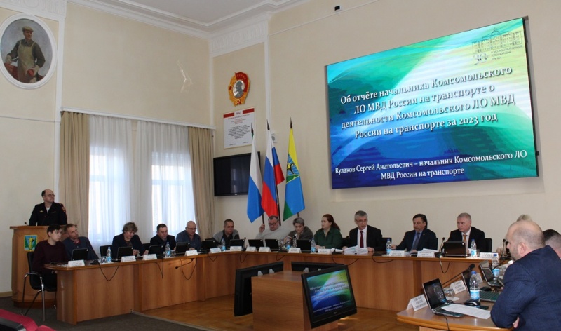 Начальник Комсомольского ЛО МВД России на транспорте Сергей Кулаков прочел перед мэром города и депутатами городской Думы доклад об итогах деятельности отдела в 2023 году
