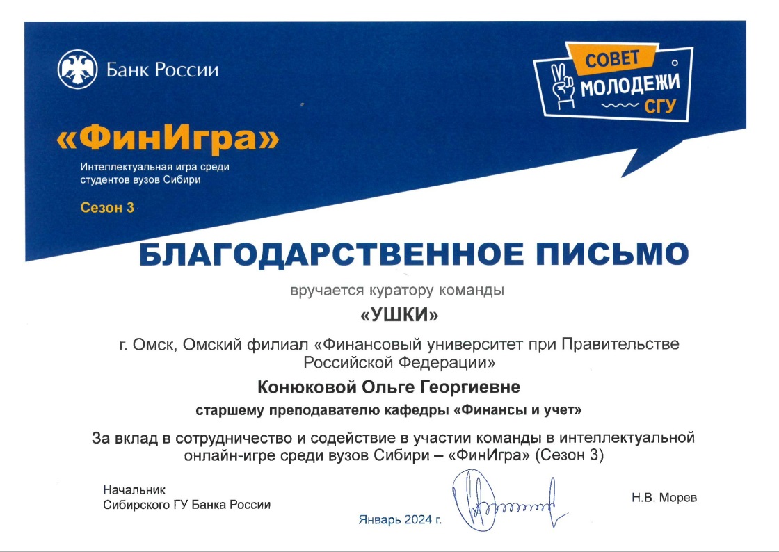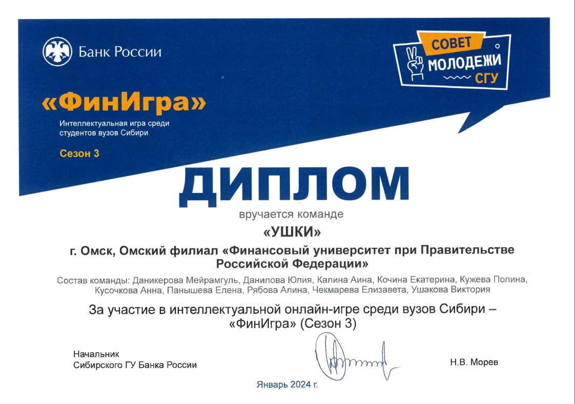 В этом году соревновались130 команд из 37 вузов, общее количество участников превысило870 студентов. Игра проходила в два этапа, в финал вышли всего 20 команд. По итогам был составлен рейтинг участников, студенты нашего университета заняли 8 место. Ключевые темы игры относились к следующим областям: - вопросы финансовой грамотности; - основные понятия экономики и финансов; - актуальные события из мира экономики и финансов; - история, деятельность и функции Банка России. Сибирское главное управление Центрального банка Российской Федерации выражает благодарность студентам-финалистам группы 3У1: Даникеровой М., Даниловой Ю., Калине А., Кочиной Е., Кужевой П., Кусочковой А., Панышевой Е., Рябовой А., Чекмаревой Е., Ушаковой В.,а также куратору и преподавателю дисциплины «Финансы» кафедры «Финансы и учет»Конюковой Ольге Георгиевне за участие в третьем сезоне интеллектуальной онлайн-игры среди студентов вузов Сибири - «ФинИгра». Сибирское главное управление Центрального банка Российской Федерации отмечает высокий уровень эрудиции студентов Финансового университета при Правительстве Российской Федерации (Омского филиала) и потенциал для развития в финансово-экономической сфере. Организатором мероприятия со стороны Банка России выступил Молодежный совет Сибирского главного управления Центрального банка Российской Федерации. |