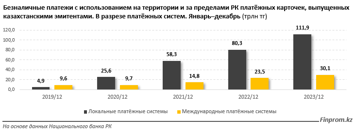 Объём безналичных платежей по карточкам локальных систем, выпущенным казахстанскими эмитентами, заметно преобладает над показателем по карточкам международных платёжных систем: 111,9 трлн тг против 30,1 трлн тг за январь–декабрь 2023 года. Объём безналичных платежей по карточкам локальных систем за год вырос на 39,4%, по карточкам международных систем — на 27,8%. При этом ещё в 2019 году на долю безналичных платежей с использованием карточек локальных платёжных систем приходилась лишь треть от всего объёма, а две трети соответственно занимали платежи по карточкам международных систем.