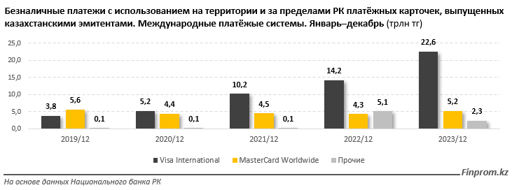 В деньгах объём безналичных платежей по картам Visa составил 22,6 трлн тг, по картам MasterCard — 5,2 трлн тг. На карточки прочих международных платёжных систем пришлось 2,3 трлн тг.