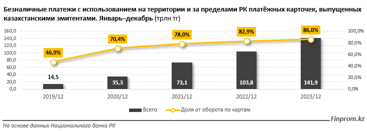 Объём безналичных платежей с использованием казахстанских платёжных карточек* за январь—декабрь 2023 года достиг 141,9 трлн тг — сразу на 36,7% больше, чем за аналогичный период 2022-го.