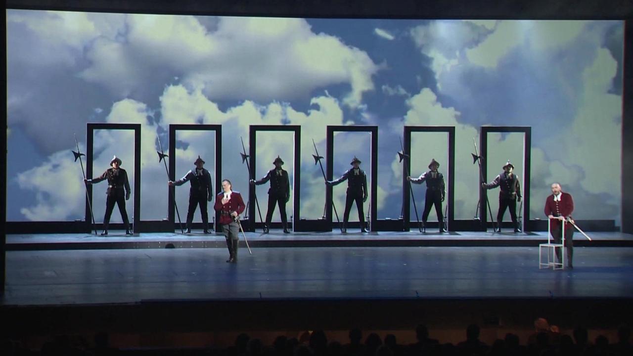 Артистов поместили в рамки. Что это – границы мировоззрения или пределы человеческой свободы – каждый решает сам. Музыкальную драму усиливают мощные хоровые сцены.