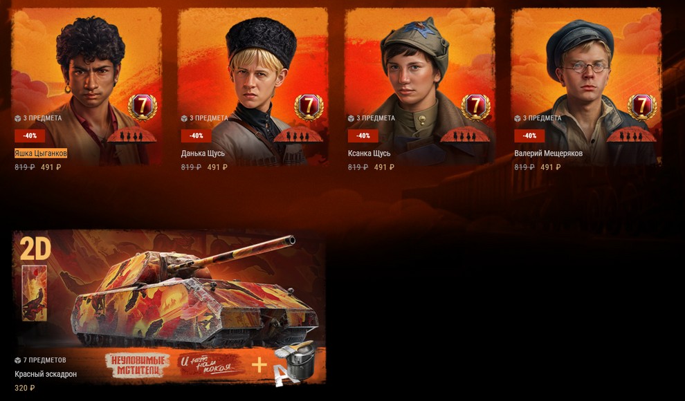 Представили «Красный эскадрон», всесезонный стиль, который создан в сотрудничестве с «Мосфильм» по мотивам кинотрилогии «Неуловимые мстители». В наличии возможность приобрести другой тематический контент: пакеты с надписями и декалью для украшения танка.