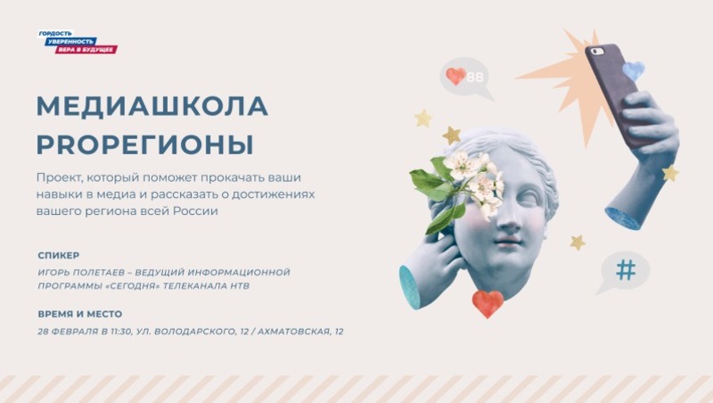 Открытие «Медиашколы PRОрегионы» состоится в штабе общественной поддержки 28 февраля в 11:30. Регистрация проходит по ссылке.