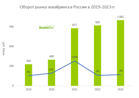 По данным «Анализа рынка эквайринга (процессинга) в России», подготовленного BusinesStat в 2024 г, российский рынок эквайринга показывает стремительный рост. По оценкам BusinesStat, за 2019-2023 гг рынок увеличился более чем в 3 раза: с 330 до 1 002 млрд руб. В 2020 г, в период локдауна и пика пандемии, число безналичных транзакций в России возросло на 60%, что было вызвано снижением объемов наличной оплаты, а также ростом количества пользователей интернет-магазинов и онлайн-сервисов. Однако на период пандемии ЦБ РФ временно ограничил уровень эквайринговых комиссий значением в 1% при оплате картами социально значимых товаров и услуг, что снизило темпы прироста оборота рынка в 2020 г. В 2021 г по ряду направлений эквайринга комиссии вернулись к докризисным значениям, на фоне роста комиссий оборот рынка увеличился более чем в 2 раза.