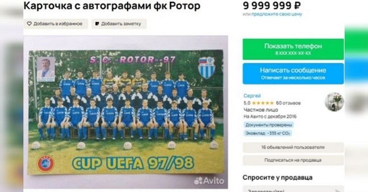 Житель Центрального района Волгограда выставил на продажу раритетную карточку с фотографией и автографами лучших игроков «Ротора» Олега Веретенникова, Валерия Есипова, Валерия Бурлаченко, Владимира Нидергауса, Платона Захарчука и др. За столь ценную для болельщиков вещь волгоградец просит без рубля 10 миллионов.