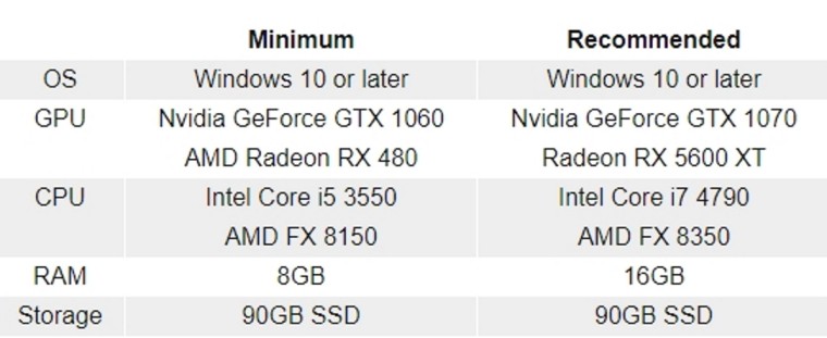 Минимальные спецификации включают операционную систему Windows 10 64-бит, процессор Intel Core i5-3550 или AMD FX 8150, 8 ГБ оперативной памяти, видеокарту NVIDIA GTX 1060 или Radeon RX 480, а также 90 ГБ свободного места на диске.