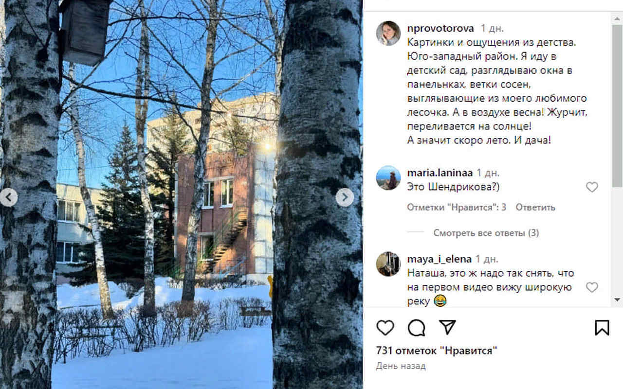Тем временем жена господина Провоторова Наталья, видимо, тоже поймала меланхоличное настроение и решила немного окунуться в воспоминания из прошлого: «Картинки и ощущения из детства. Юго-Западный район. Я иду в детский сад, разглядываю окна в панельках, ветки сосен, выглядывающие из моего любимого лесочка. А в воздухе весна! Журчит, переливается на солнце! А значит, скоро лето. И дача».