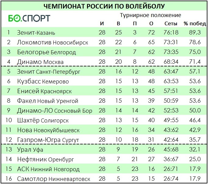 Как и в прошлом сезоне, казанский «Зенит» стал победителем регулярного чемпионата России. Зенитовцы стали недосягаемы для соперников после домашней победы над «Нефтяником» (3:0). В этой встрече подопечные Алексея Вербова в каждой партии выполняли специальные тренерские задания.
