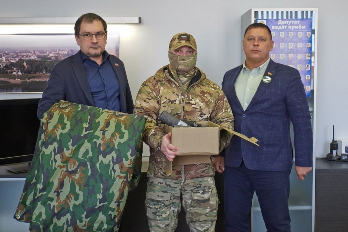 Депутаты Кемеровского Горсовета от «Единой России» Константин Бондарев и Василий Еремин передали приехавшему в отпуск участнику спецоперации одеяла от тепловизора и глушители для автоматов Калашникова.