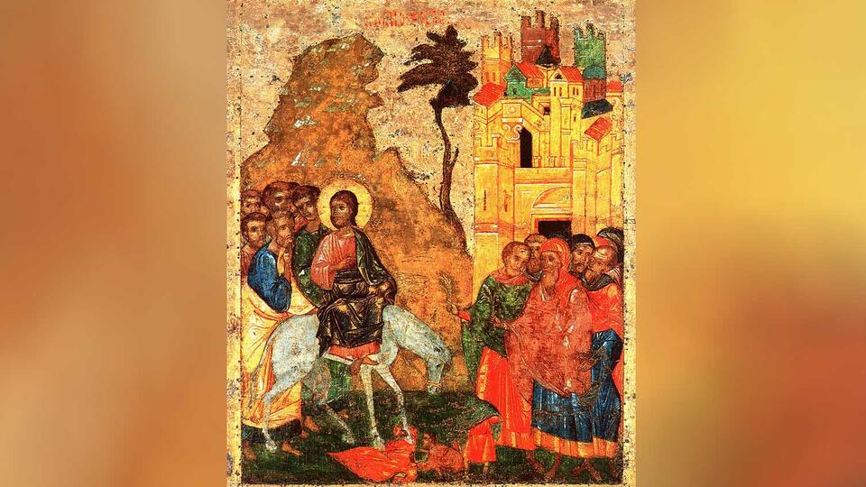 Он следовал по дороге, которую люди устилали своей одеждой и пальмовыми ветвями. Встречали Христа как победителя и пели во славу: "Осанна (спасение) Сыну Давидову! Благословен грядущий во имя Господне!"