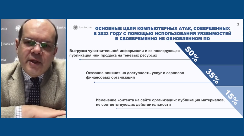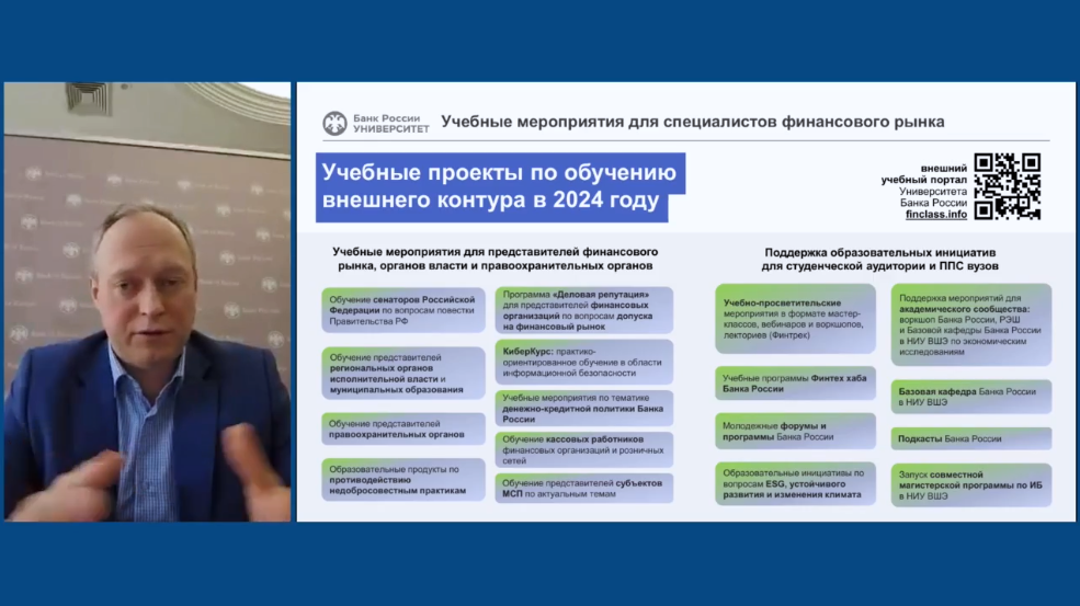 Директор Университета Банка России Андрей Афонин доложил о ключевых вызовах и решениях в подготовке и подборе кадров для финансовой отрасли. Далее выступили Андрей Выборнов, заместитель директора Департамента информационной безопасности Банка России, и Юрий Баранчук, депутат Тюменской областной Думы.