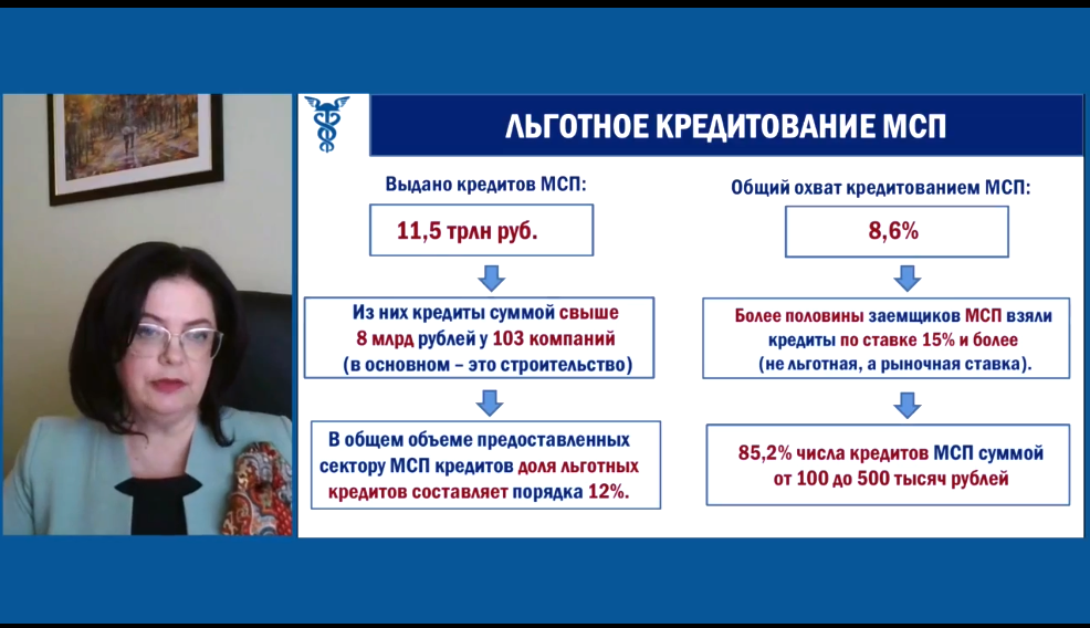 В своем выступлении Елена Дыбова остановилась на оценке доступности льготного кредитования субъектов МСП и перспективах его развития.