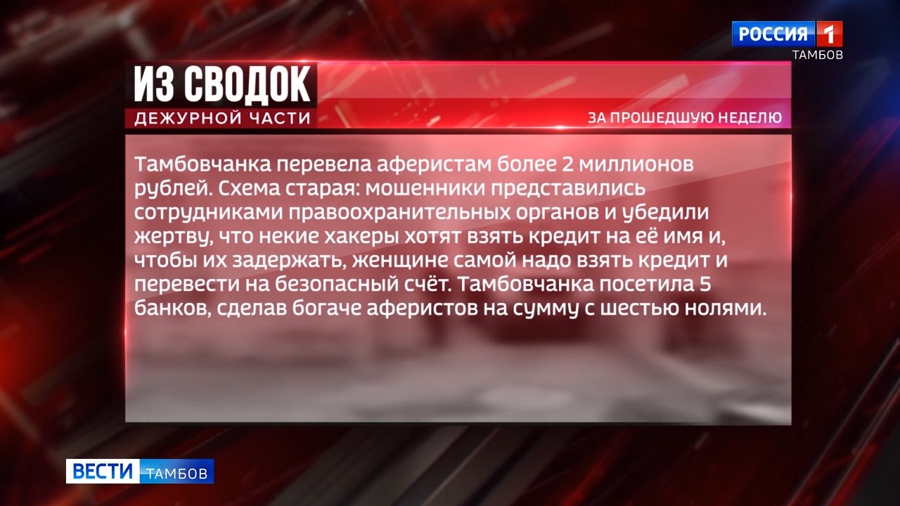 Тамбовчанка перевела аферистам более 2 миллионов рублей. Схема старая: мошенники представились сотрудниками правоохранительных органов и убедили жертву, что некие хакеры хотят взять кредит на её имя и, чтобы их задержать, женщине самой надо взять кредит и перевести на безопасный счёт. Тамбовчанка посетила 5 банков, сделав богаче аферистов на сумму с шестью нолями.