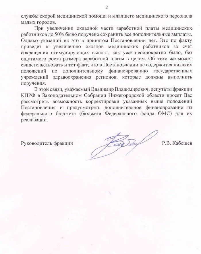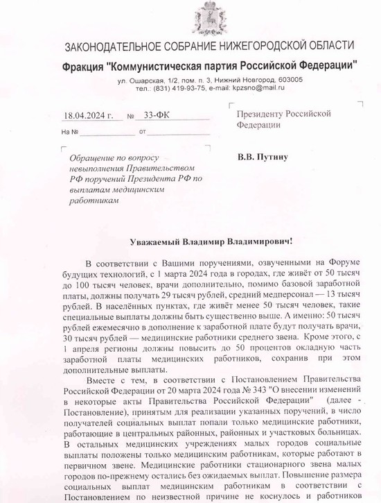 Фракция КПРФ в Нижегородском ЗакСобрании направила обращение к Президенту по ситуации с выплатами медикам