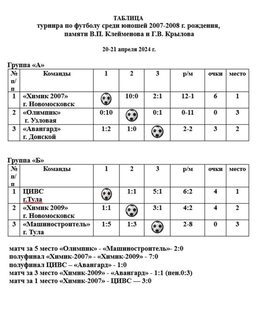 В первом матче юноши «Химика-2009» со счетом 3:1 сумели одержать победе над юношами «Машиностроителя г.Тула. Победители зимнего первенства Тульской области 2024 года - юноши «Химика-2007» встретили достойное сопротивление игроков команды «Авангард» г.Донской. Нашим юношам удалось в первом тайме дважды поразить ворота соперника, а в свои пропустить лишь один и одержать важную победу со счетом 2:1.Во втором своем матче они со счетом 10:0 разгромили команду «Олимпик», ранее лишь с минимальным счетом уступившую «Авангарду» и заняли первое место в группе «А».