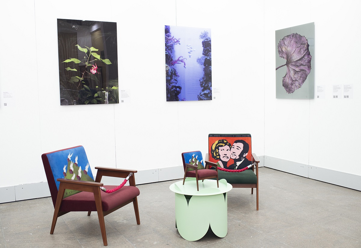 На стенде artz.work x HSE ART AND DESIGN STORE разместились фотографии, серия кресел с работами современных художников и стеллаж, разработанный студентом магистратуры направления «‎Предметный и промышленный дизайн».