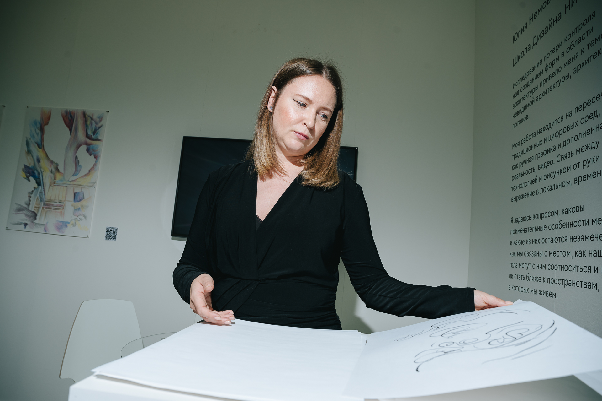Одним из интересных проявлений сочетания различных методов и способов творить являются работы Юлии Немовой — художницы, архитектора, режиссера и студентки 1-го курса магистратуры «Практики современного искусства». Екатерина Ханина, представитель Юлии на ярмарке, рассказала о том, как возможно сочетать видеографику, искусственный интеллект и изобразительное искусство. «В представленном на выставке видео автор выявляет с помощью виртуальных технологий невидимое пространство между искусством и зрителем», — отметила она.