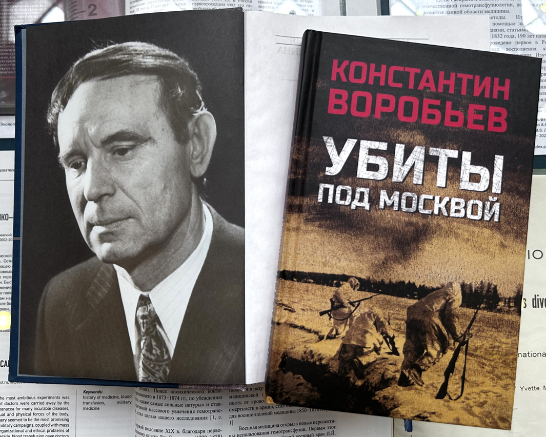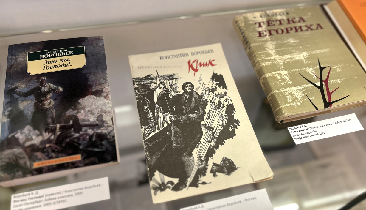 В повести «Убиты под Москвой» Константин Воробьев рассказал о событиях, очевидцем которых он оказался во время ожесточенных боев в конце 1941 г. Впервые произведение напечатали в журнале «Новый мир» (1963 г.), в котором его согласился опубликовать главный редактор Александр Твардовский. В 2001 г. Константину Воробьёву посмертно была присуждена литературная премия Александра Солженицына «за произведения, которые в полновесной правде явили трагическое начало Великой войны, её ход, её последствия для русской деревни и позднюю горечь пренебрежённых ветеранов». На выставке представлено «Слово при вручении литературной премии...». Проследить сложную судьбу писателя и его произведений можно в документальной повести-эссе «Серебряная дорога» Елены Джичоевой.