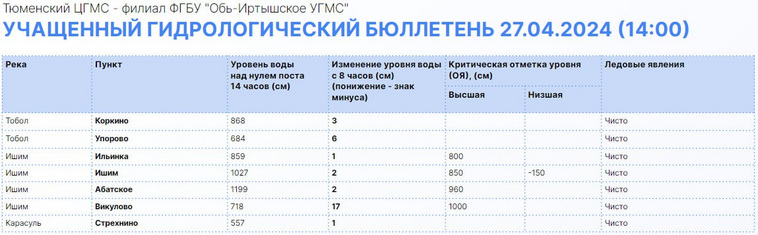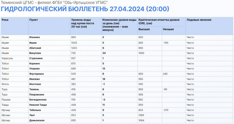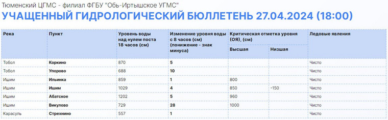 Данные по росту уровня воды в реках Тюменской области на 8:00 27 апреля