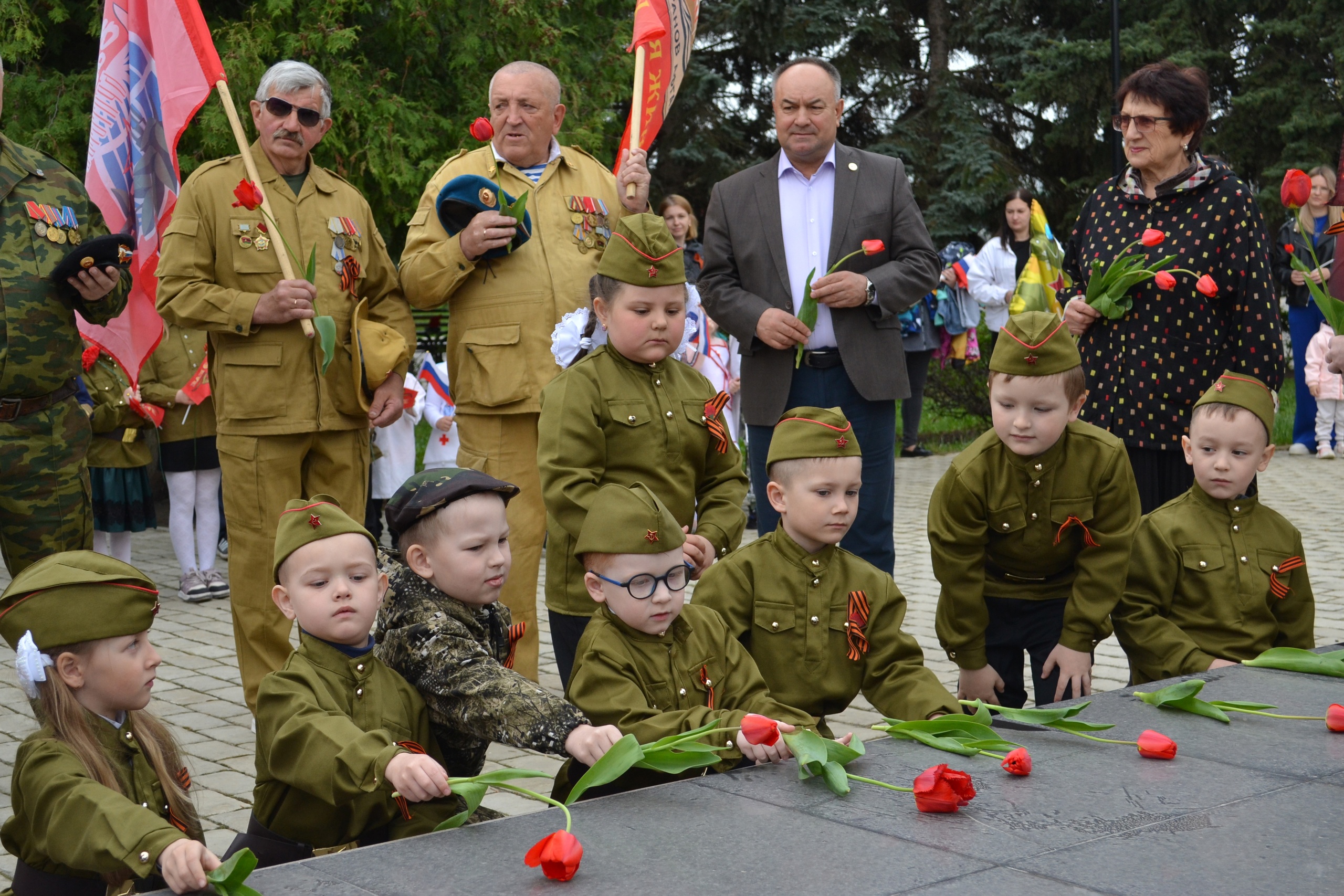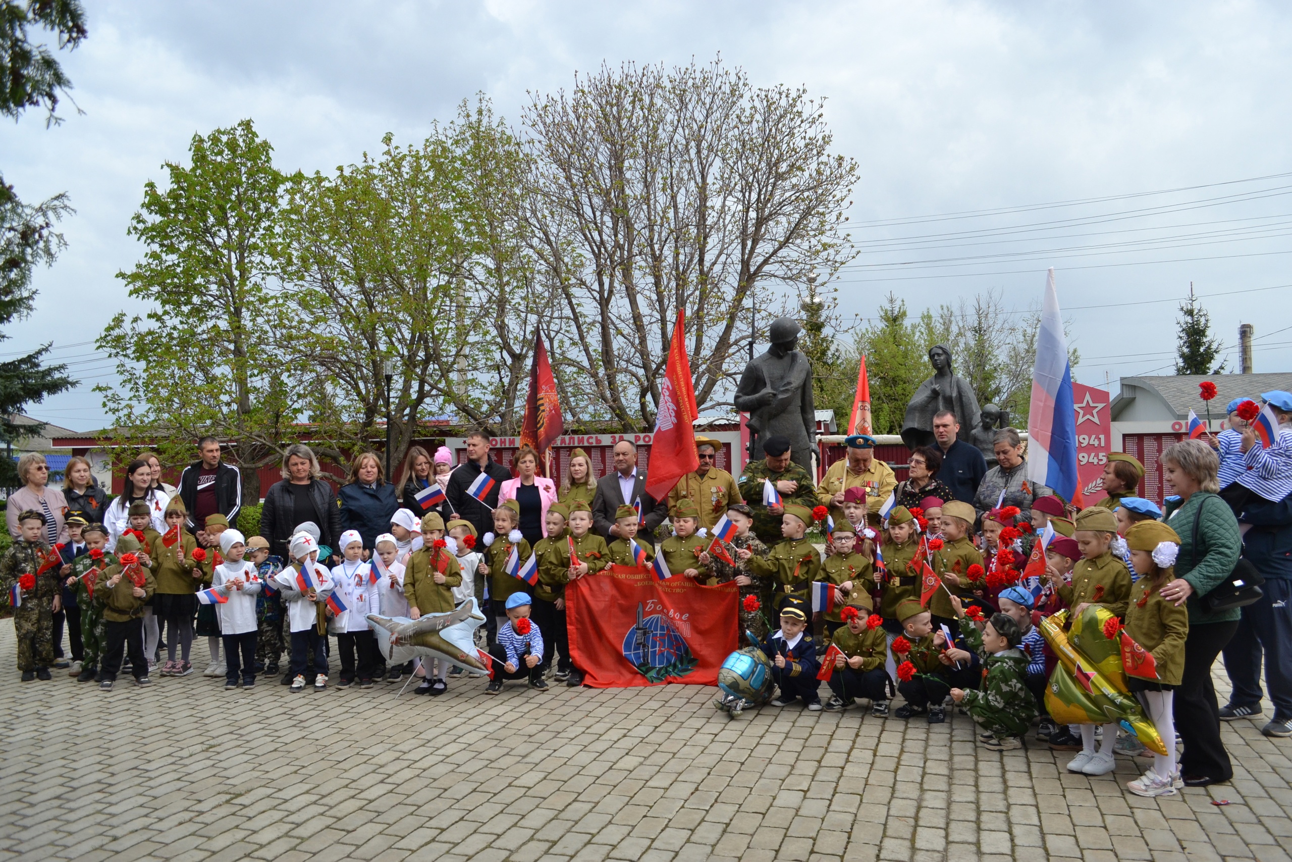 Воспитанники Клуба патриотического воспитания при детском саде «Рябинка» в военной форме с цветами и флажками в сопровождении родителей и воспитателей проехали по центральным улицам города.