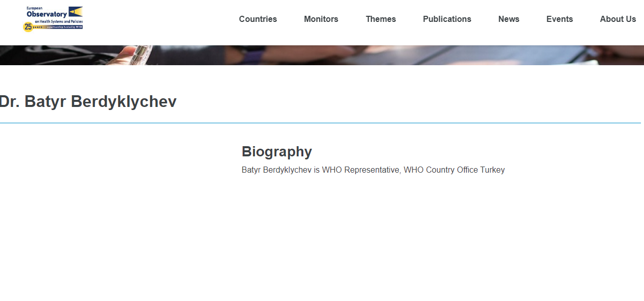 Примечательно, что, несмотря на богатый опыт работы на руководящих постах в структуре ВОЗ, о докторе Бердыклычеве практически нет никакой официальной информации. Вместо биографии - чистый лист. На сайте Европейской обсерватории по системам и политике здравоохранения на странице, посвящённой Бердыклычеву, указано только то, что он представитель ВОЗ и глава странового офиса ВОЗ в Турции.