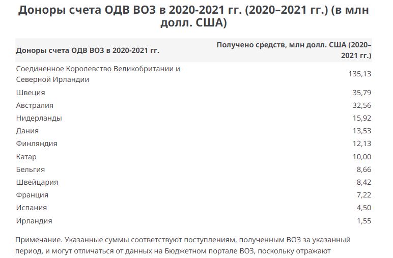 Сомневаться в объективности Всемирной организации здравоохранения заставляет и список её крупнейших спонсоров. По официальной информации, первые строчки в списке главных меценатов организации занимают Британия и Швеция - производители вакцины от коронавируса (AstraZeneca). Кроме того, СМИ сообщают, что ВОЗ также активно финансируют США (Pfizer, Moderna) и американский миллиардер Билл Гейтс.