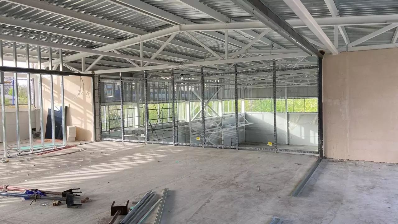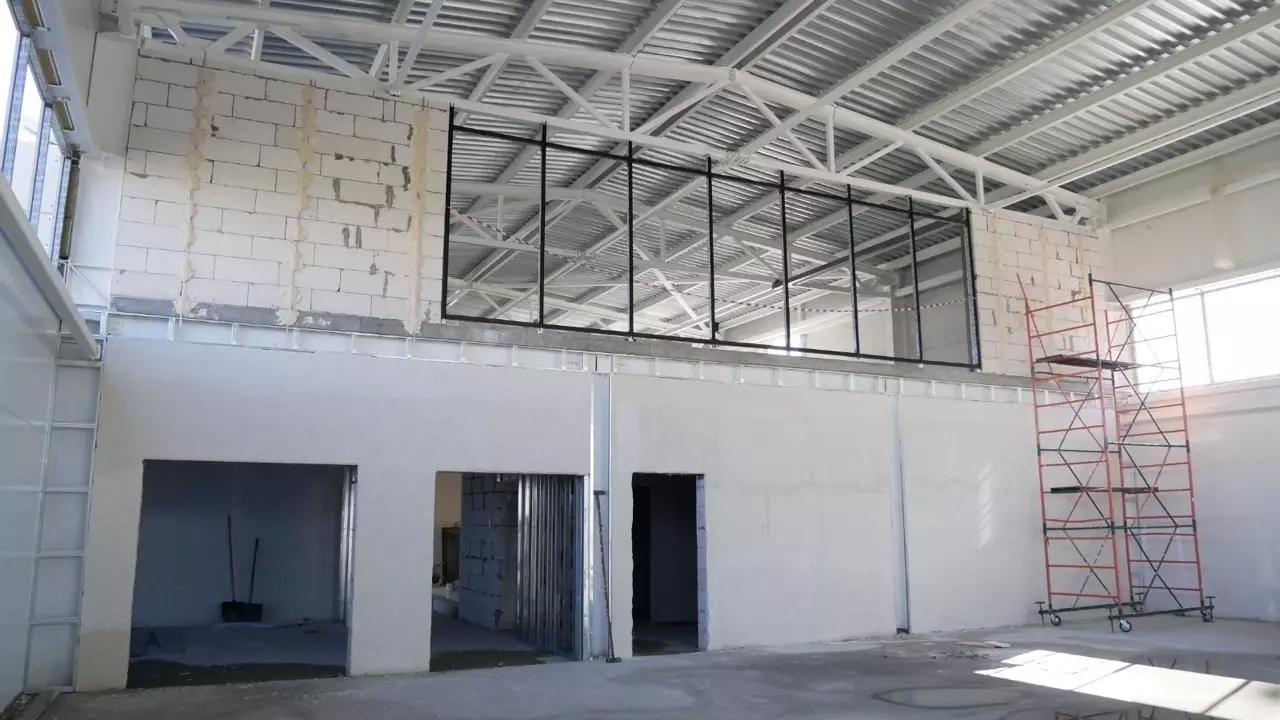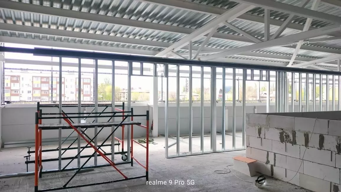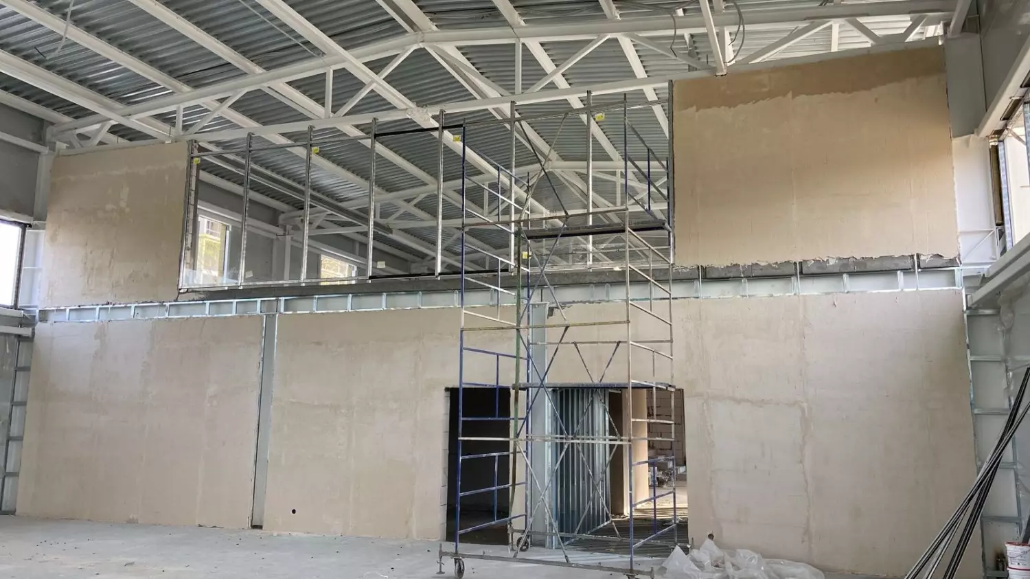 Параллельно с этим рабочие продолжают возводить внутренние перегородки, штукатурить стены, а также приступили к устройству внутренних инженерных систем — систем электроснабжения, теплоснабжения и вентиляции.