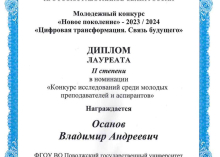 По результатам работы экспертной комиссии конкурса аспирант ПГУТИ, старший преподаватель кафедры УТС Осанов Владимир Андреевич был признан лауреатом II степени в номинации «Конкурс исследований» с проектом «Исследование методов и алгоритмов декорреляции видеотрафика в туманных вычислениях».