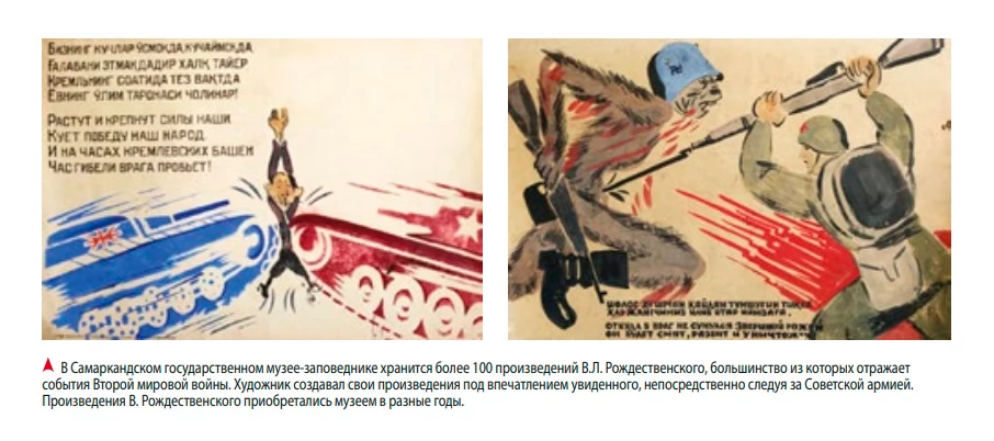 События культурно-художественной жизни Самарканда с 1941 по 1945 год - особая страница в истории города. В силу сложившихся обстоятельств Самарканд становится культурным центром. На следующий день после выступления Вячеслава Молотова, в котором он 22 июня 1941 года от имени правительства обратился к народу, в самаркандском Союзе художников состоялось экстренное собрание, где было принято решение о немедленном начале агитационно-художественной работы. К ней позже подключились и художники, прибывшие в древний город вместе с эвакуированными Московским художественным институтом и Государственным институтом декоративно-прикладного искусства, Ленинградским и Киевским художественными институтами, которые разместили в старинных медресе Шердор и Тиллякори на Регистане. В 1942 году из блокадного Ленинграда приехала Академия художеств.