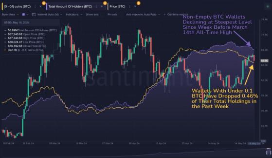 По данным специалистов, на прошлой неделе, когда цена биткоина превысила $67 000, владельцы криптокошельков, в которых хранится менее 0,1 BTC ($6668 по текущему курсу), избавились от 0,46% принадлежавших им монет. При этом небогатые трейдеры наращивали запасы криптовалюты во время апрельского медвежьего тренда и начали фиксировать прибыль 24 апреля, когда стоимость монеты достигла локального пика.