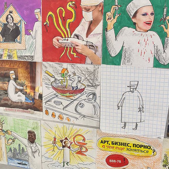 У всех галерей, за некоторыми исключениями, были одинаковые по размеру стенды, но искусство самое разное. Знаменитая петербургская галеристка Марина Гисич в этот раз сделала ставку на художника Бориса Казакова, который сочинил массу историй, завязанных вокруг врачей. Врачи у него атакуют музей, наводят порядок в деревнях, фигурируют в самых разных абсурдных ситуациях. Хорошо известный в Петербурге художник строит свое искусство на том, что называется индивидуальной мифологией, а свои работы создает в том числе и в технике выжигания по бумаге (150–300 тыс. руб.).